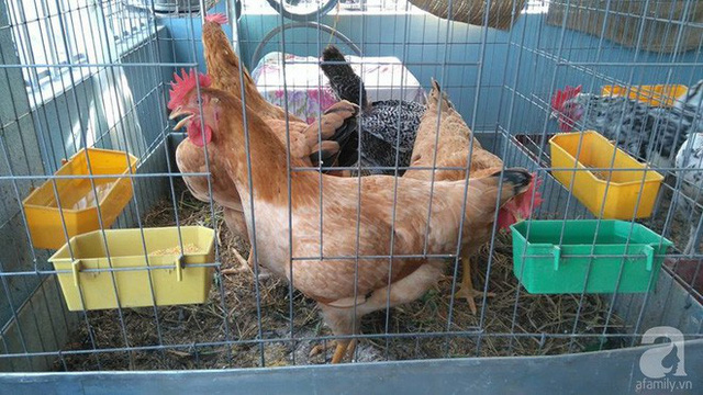 Khoảng sân thượng rộng 80m² đã được chị Nguyễn Mai Anh (Lê Chân, Hải Phòng) tận dụng để làm thành một "trang trại" thu nhỏ. Chị dành hẳn 1 nửa diện tích sân thượng để trồng rau sạch, nửa diện tích còn lại để trồng cây cảnh và nuôi gà.